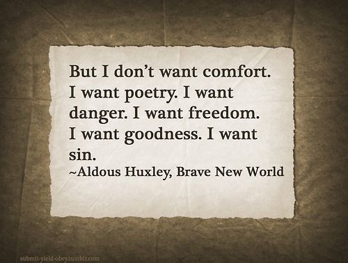 đź–¤ “But I don’t want comfort. I want God, I want poetry, I want real danger, I want freedom, I want goodness. I want sin.” – Aldous Huxley. This is actually on my blog page. I want a challenge in my life I don’t want to live comfortably. I want to step outside my boundaries and do something that will either cause me to fly or fall and I’m writing it right now. I am too creative and smart to lead a normal life. I was meant to do something extraordinary.