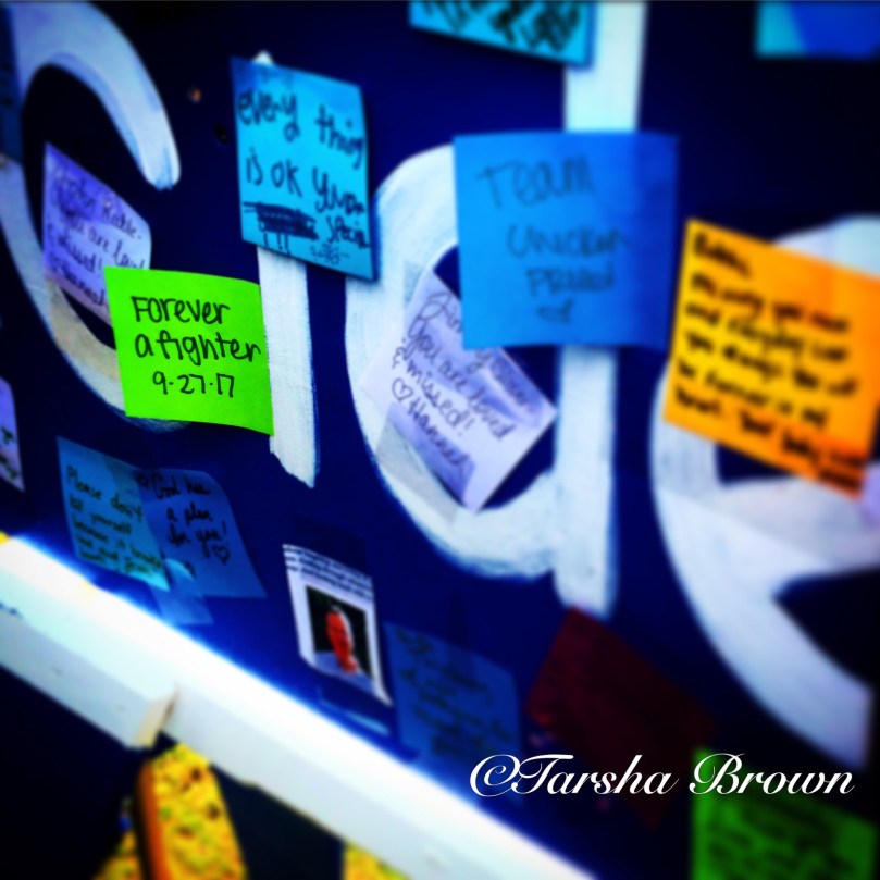 This is my new favorite picture from the walk. (It may show up a few more times) my green sticky note is for my personal struggle. This is tattooed on the back of my neck and still stands true. I will fight for my life everyday until it’s my time. My daughters sticky note is right above it and it means so much that she cares so deeply about this. Out of all the up close pictures this one is unique and full of sentimental value.