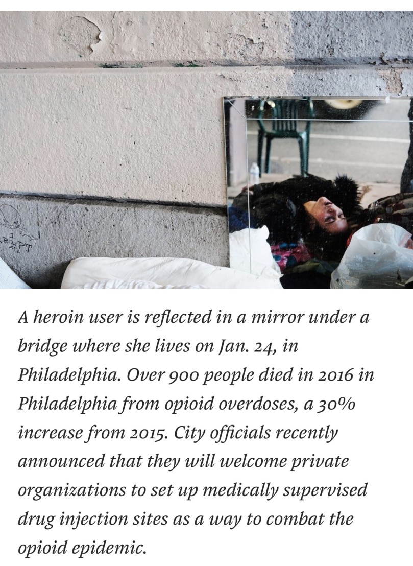 This photo spoke to me for so many reasons. You can see the pain and truth behind the addiction, but you also wonder about the addict. I want to know if these people know they are being photographed in these moments do we help them or leave them in this state because it is better for a few dollars. Ok now that I’ve expressed those feelings let us explore the other part of this the bigger part of this. They want to set up medically supervised drug injection sites to combat the opioid epidemic. I read an article from NPR (I don’t always find it as a credible source but for this purpose I will use it.) These places will provide clean supplies, a safe place without fear or shame and is equipped with staff to help. Are we encouraging drug use because it is safe now? Is this going to help the opioid epidemic around the country? Isn’t this just going to piss off dealers when the government takes their business? Are addicts going to use this without worrying about being tracked by the government? These clinics do exist in Europe, Canada and Australia. It says that they bring their own drugs (I guess the dealers pockets stay lined.) The staff are also equipped to handle overdoses.