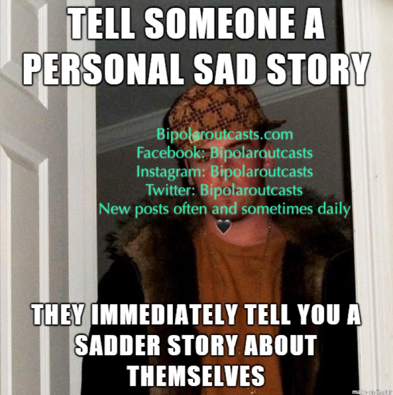 Today sucked. My dreams are constantly getting worse and I am so tired I want to stab someone. I wouldn’t actually stab anyone because I don’t want to go to jail but people make it really difficult not to unleash the evil that is hidden deep in my soul. I can’t with stupid people…I just can’t. Why is it that someone always tries to one up you. I can’t talk to people about my illness or lack of sleep because they are always trying to one up you. It looks like this…