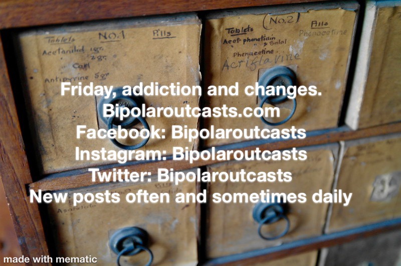 It is Friday and normally wouldn’t be this excited about it but I open tomorrow and then I’m off Sunday for Easter. Wayne has a big surprise for me tomorrow after work. I’ve been reflecting on things today after noticing on a social media page. Drugs (even scripts) make you a horrible needy person or as I called one point in time a sociopath. I honestly believe that anyone who struggles with drugs or alcohol possesses those traits but what gets me is the people you hurt because of this assume this who you are. I fucked up so much in 2015 I get it but it still gets held against me. I have a Bipolar Chronicles about addiction you will see soon.