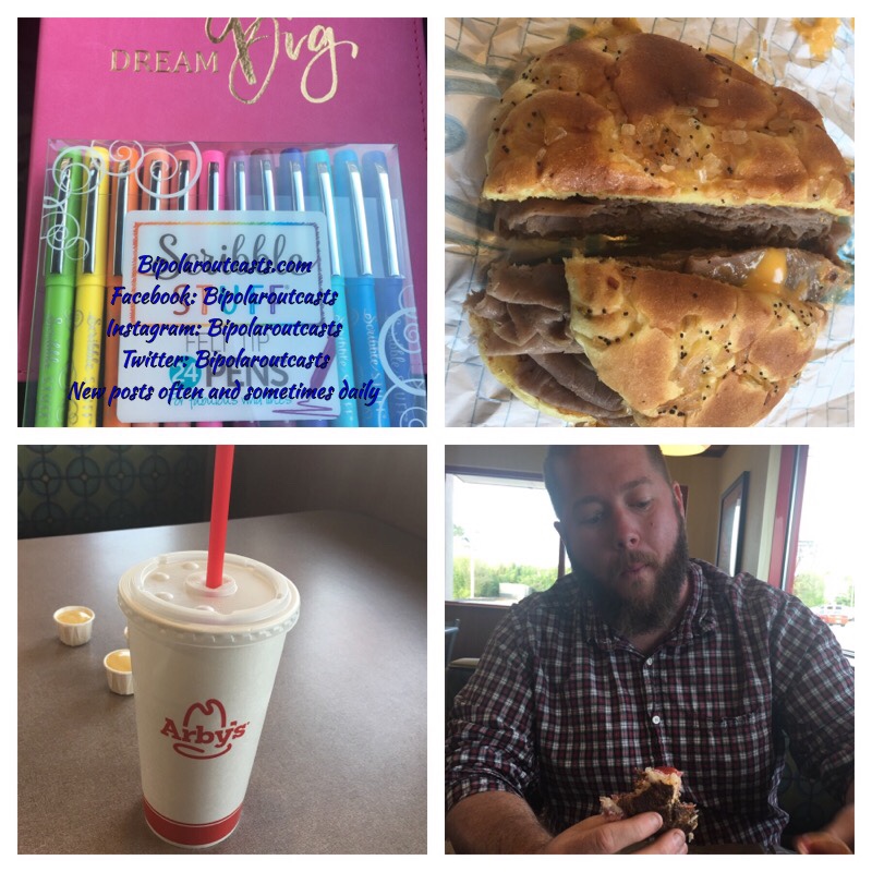 Today was AMAZING! Work was just work and I couldn’t wait to get off because Wayne and I were going to Walmart to get a new tire for his truck and that meant an adventure and I love new adventures. We went to Madison to Wal-Mart and after he got his truck settled we shopped around Wal-Mart and I printed some pictures off my phone then got a new journal and pens. There is just something about a new journal blank pages ready for your thoughts, dreams and emotions. I’m so proud of myself and the new steps I’m taking to improve myself and my writing. I printed my book out and I’m rewriting and going through with my trusty red pen. We went to Arby’s and ate. I just have so much fun with him in every adventure we take together. It is amazing how these little things can improve your moods. He makes me happy and forgot the horrible dreams and the tornado in my brain.